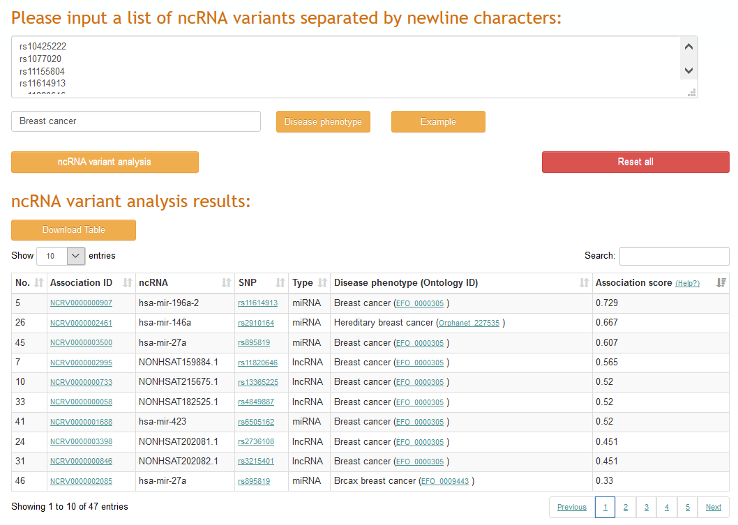 To make the disease phenotypes more consistent with other databases, ncRNAVar provides both the identifiers and links for the disease phenotypes in the EMBL-EBI Ontology Lookup Service resources, including Experimental Factor Ontology (EFO), Orphanet Rare Disease Ontology (ORDO), Human Phenotype Ontology (HPO), Human Disease Ontology (HDO) and NCI Thesaurus OBO Edition (NCIT) etc. The majority of diseases phenotypes in ncRNAVar are annotated by EFO, while the rest disease phenotypes, which EFO does not cover, are annotated by other ontologies.